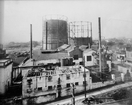 Production of gas from coal commenced on this site in 1848 with the establishment of the Savannah Gas Light Company where a century later, it handled storage capacity of up to 2 million cubic foot tanks. When the Kehoe Iron Works dissolved due to the Great Depression, the Gas Company added that plant to its existing facility. In 1946, the campus included a demo “home service kitchen and auditorium” called the Wonderflame Room.